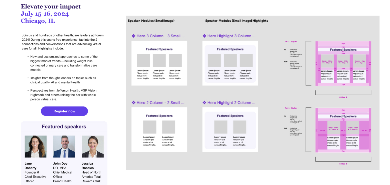 I designed a fully modular system in Figma using an Atomic Design methodology, translating Marketo requirements into a flexible shell, a robust module library, and repeatable templates. Special attention was given to high-complexity use cases such as event communications, newsletters, and categorized campaigns (e.g. Partner Essentials), with extensive exploration of spacing, padding, and layout permutations to ensure long-term durability and ease of use for non-design teams.